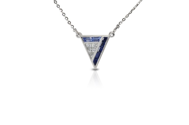 This pretty pendant comes from Kavant & Sharat. They note, “A striking combination of perfectly cut princess-cut purple sapphire and baguette-cut fancy sapphires, this pair promises bold colors and uniqueness.Uncompromisingly modern and exuding, the collection draws inspirations from works during the Cubism movement to the Abstract Art movement. Simple geometric forms and clean lines asserts the abstract style and composition of this collection.”