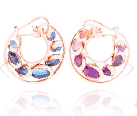 The site explains, “This delicate pair of earrings is crafted from 18k rose gold. The Purple side (pink amethyst, Brazilian amethyst, African amethyst) can revert to reveal the blue side (blue moonquartz, sky blue topaz, London blue topaz). The jewel features 28 stones for 16,3 carats. Pick the color you want to show regarding your outfits!”