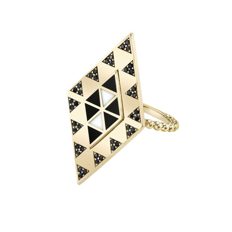 Satisfy your geometric cravings with this ring from Harwell Godfrey. The piece is made of 18K yellow gold with black diamonds, black onyx, and white enamel. It sells for USD$2,750.