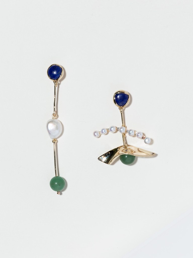 These Alexander Calder-esque earrings by Faris may be (I think) sold separately given that you have the option to hand more than one to your cart. They are described as a “playfully colored, asymmetrical pair with pearls and gemstones that dangle and dance. Long side measures approximately 3 1/5″ in length and adjacent side measures 1 1/5″ in width. Available in Bronze with Lapis, Jade and Pearl and Sterling Silver with Red glass, Pineapple Jasper and Pearl. Handmade in Seattle