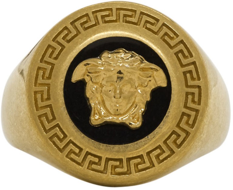 This ring uses the fashion house’s signature Medusa logo on a gold tone ring with a black enamel background. This sells for Cdn$290.