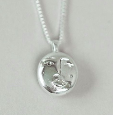 This sterling silver necklace from Wolf Circus, dubbed the Evelyn, appears to show a stylized type of man in the moon face. It comes with an 18 inch sterling chain (the design is also available in gold plate); this version sells for CDN$185.
