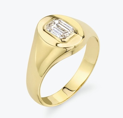 The signet ring is a classic jewelry box piece, but the addition of an emerald cut diamond gives it a unique freshness. By Vrai and Oro, this is available in 14k yellow, pink or white gold, set with a half-carat emerald cut white diamond.