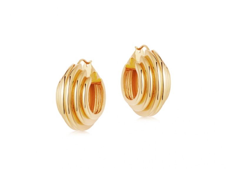They note, “1987 | RETRO REIMAGINED. Giving a nostalgic nod to the 80s, the Lucy Williams Medium Chunky Ridge Hoops are a standout piece from the collection. With a graduated ridge detail that adds depth and dimension, these hoops are as striking during the day as with an LBD at night. The 1987 collection revives classic vintage style, inspired by Lucy’s memories growing up and a love of her mother’s jewellery box. The collection reimagines nostalgic pieces inspired by the 80s and 90s, created with Missoma’s signature layering in mind. Metal: 18ct Gold Plated On Brass. Dimensions: 26mm hoops; Width 13 mm. Weight: 17.8g pair.”
