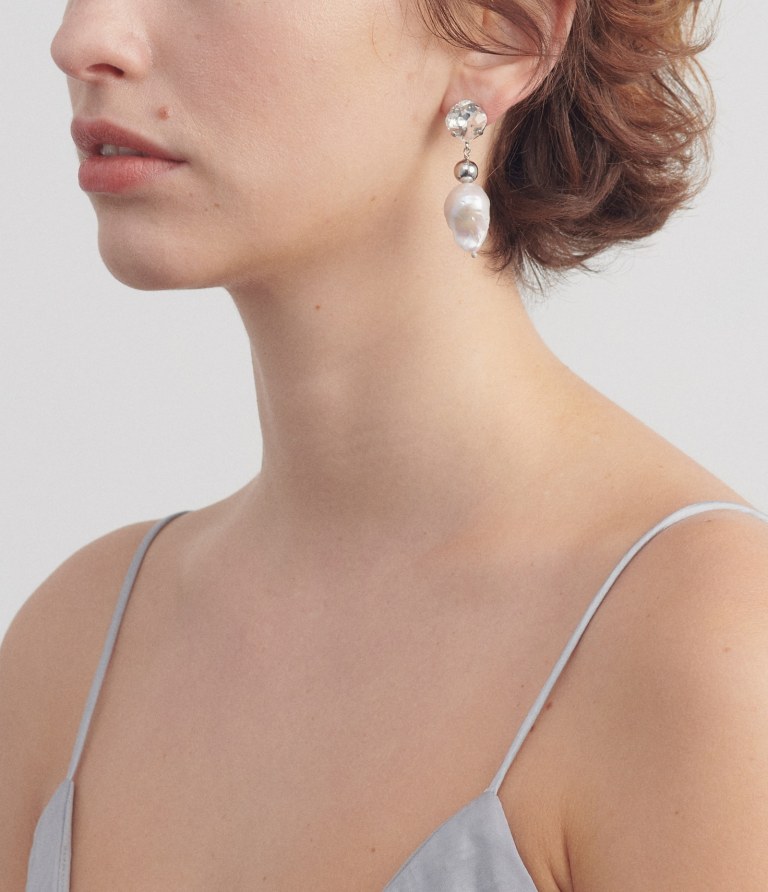 The designer’s site notes, “Part of the FW19 collection, the Laurie clip-on earrings are made of brass dipped in palladium, Swarovski crystals and baroque freshwater pearls. They are designed and handmade in France. Keep away from water or cosmetics for a longer lasting, nickel-free. Each piece is unique as we work with freshwater pearl. Size, shape and color may slightly vary from the picture.”