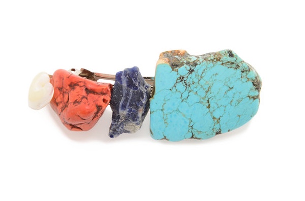 Embellished hair accessories are gaining trend momentum, with jewelled hairbands and clips taking pride of place. This barrette by Svnrshop is set with mother of Pearl, orange turquoise, lapis lazuli, magnesite.