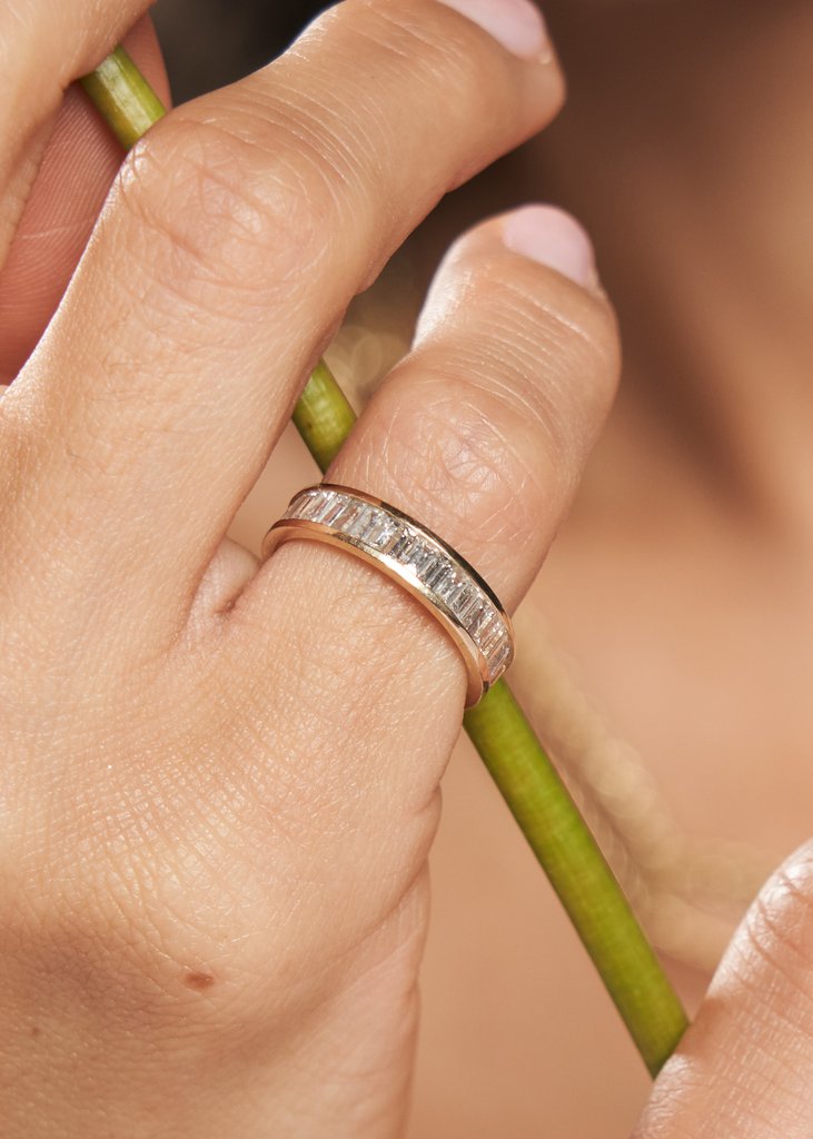 Diamond eternity bands are a jewel box classic and for some, a staple item. (Marilyn Monroe’s wedding from Joe DiMaggio is quite similar.) This one, dubbed the North South, from STVDIO Jewelry, is “a channel set band composed of north-south facing white diamond baguettes. The band is eternity style, which means diamonds wrap around the entire exterior of the band. A little deco, a touch modern, this piece is perfect to tie a stack of rings together, compliment a vintage engagement ring, or really stand out on its own. Our baguette pieces are made with vintage sourced stones, and all diamonds are G-H Clarity, and VS Clarity. The North South Baguette Band is available in 14k yellow, and 18K yellow gold. Please note, since this style of band is eternity, it is not able to be re-sized once made, so selecting the correct ring size is very important. ”