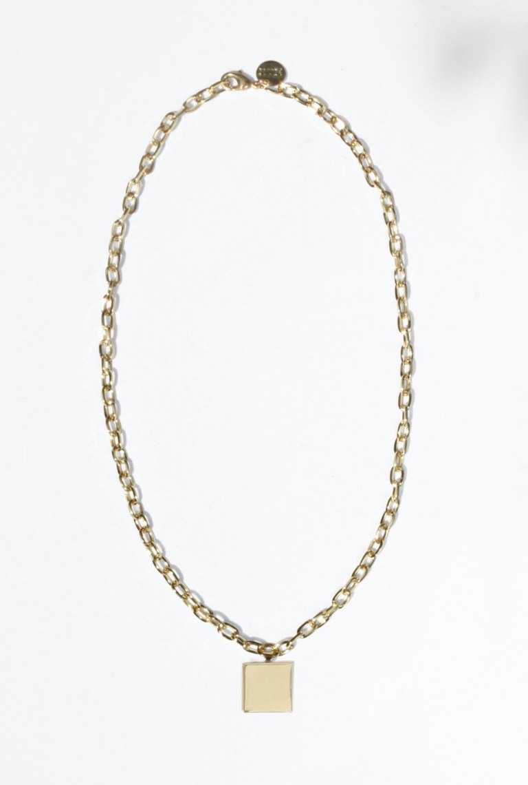 The word is that chains will be a big jewellery trend in 2020. This version, by Young Frankk, makes it more affordable by using gold plated brass. It comes complete with a square pendant that measures .75 of an inch, attached to an 18 inch chain. It’s shown stacked with the brands other chains.