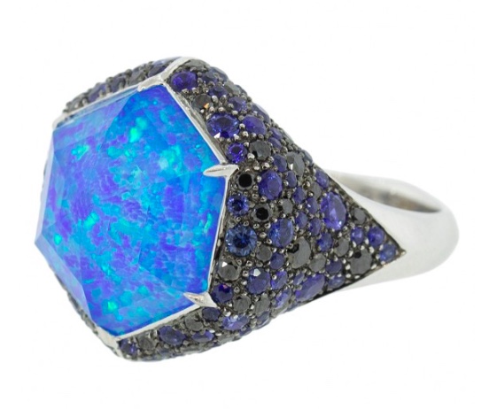 So though I do love me some opals, I would trust my klutz tendencies to ruin a gorgeous opal ring. But the good news – though this Stephen Webster ring looks like opal, it’s “black opalscent, clear quartz, crystal haze (9.71 carats); blue sapphire pave (1.95 carats); and black diamond pave (.63 carats) set in 18k white gold.