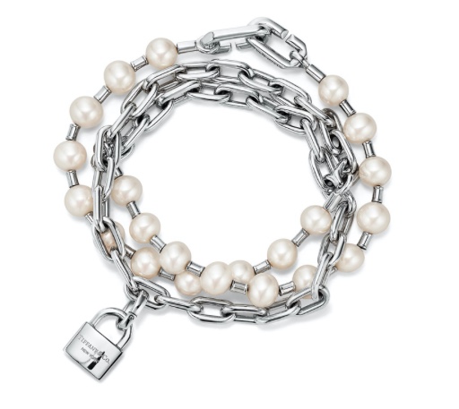 The Tiffany HardWear line is supposed to be their grittier line (or as they describe it, subsversively elegant). This bracelet features strands interwoven with freshwater pearls, with a lock detail. It’s more soft than subversive to me.