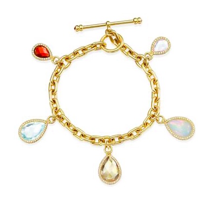 Charm bracelets come and go in terms of popularity, but they will always have a home on plenty of wrists. This one from Nina Runsdorf has “charms in citrine, garnet, opal, light blue topaz, and rose quartz surrounded by pave diamonds on a yellow gold chain. Two cabochon rubies decorate the clasp for an added touch of deep red. Wear on its own or layered with your most coveted bracelets.”
