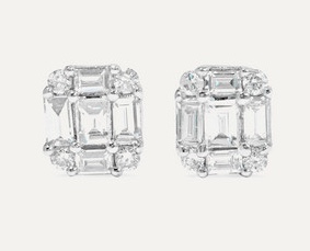 These earrings by Stone and Strand look like a single emerald cut diamond, but in reality are made up of baguette and round cut stones. They are set in gold but the carat weight and karat type are not specified.