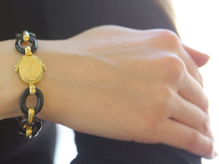 Elizabeth Locke takes inspiration from classical jewelry designs. Here, a simple chain link bracelet made with black jade and secured with a hammered 19k yellow gold crane clasp, and gold rings holding the jade together.