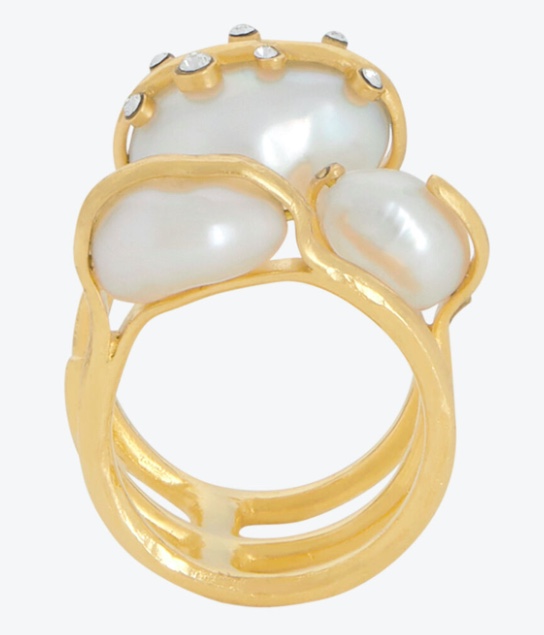 The ring is made of gold-plated brass set with resin pearls and Swarovski crystals, and sells for USD$620.