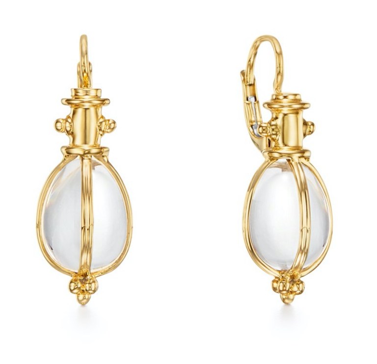 Temple St. Clair‘s work has a classic look to it – as in classical elements. Here, she uses an amulet form that repeats in her work, with a piece of rock crystal wrapped in 18k yellow gold.