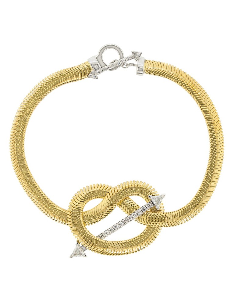 This interesting gold and diamond bracelet is by Nikos Koulis. It’s made of 18k yellow gold, accented with a knot and white diamond (.46 carats) encrusted arrow.