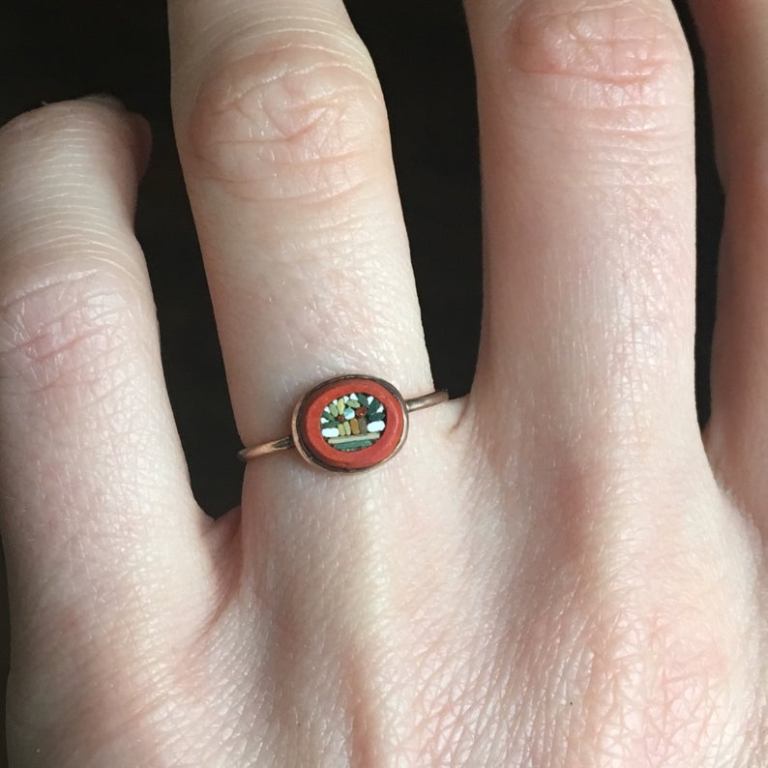 Micromosaic jewelry became a favoured souvenir when rich Europeans did their grand tours of the continent. Generally they showed nature scenes, or historic buildings. This ring is what I would call sweetly naive … the quality is not top drawer and you kind of have to squint to see the giardinetti/flower bouquet in the design. Which makes me kind of love it. It wouldn’t have come from a top drawer jeweller but I bet it meant a ton to the person who wore it.