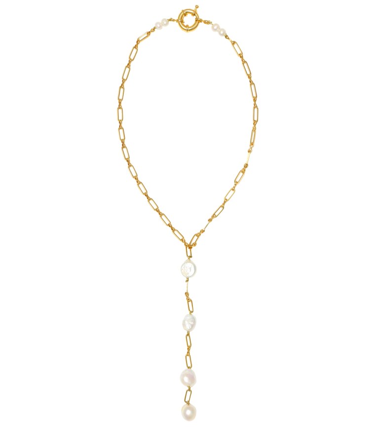 This piece takes a classic y-front necklace and adds some pizazz. The site notes, “Timeless Pearly draws from natural elements to create a unique range of statement-making jewelry, of which this necklace is a part. Crafted in France from gold-plated brass, it has a chunky chain, which drops down to suspend a combination of chains and freshwater pearls.”