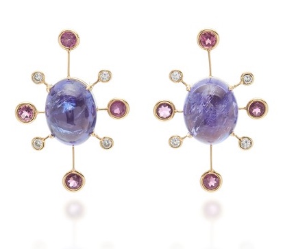 These pretty earrings remind me of the designs inspired by the Sputnik space mission in the 1950s. By Yi Collection and for sale by Moda Operandi, the site says, “Inspired by a supernova, Yi Collection’s earrings are made in a delicate stud design from 18-karat yellow gold. They’re centered with a polished tanzanite stone complete with protruding diamond and tourmaline ‘rays’. Wear yours with blush or lavender tones to complement its distinct hues.”