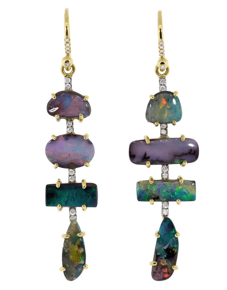 These opal and diamond earrings are by Irene Neuwirth. They are made with 18k yellow and white gold, set with .19 carats of diamonds and 13.30 carats of boulder opals.