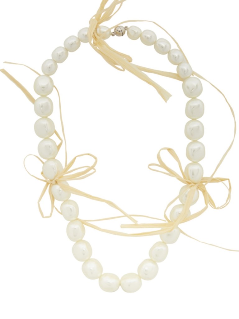 This is described as, “Faux-Pearl necklace in off-white. Bowed raffia accents throughout. Magnetic fastening in silver-tone. Approx. 19” length.”