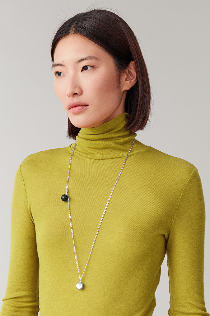 I’ve become a big fan of Cos jewelry, especially their sterling silver pieces. So much so, I picked this up last week. It’s an intriguing necklace with a semi precious bead and a sterling silver ball. The closure allows you to arrange the chain and the beads in multiple ways – perfect over a long dress.