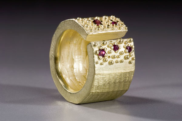 Dahlia Kanner handcrafts her jewelry in gold, sterling silver and precious stones. Here a chunky but sophisticated split gold band acceded with rubies.