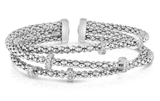 This pretty cuff bracelet is part of a larger collection by Phillip Gavriel. “Phillip Gavriel’s best-selling Popcorn Collection features rich textures and eye-catching fine jewelry designs. Our multi-row gold diamond bracelet now comes in Sterling Silver! Featuring .15ct diamond stations, this bangles three-dimensional modulation creates depth and sparkles when it hits the light.”