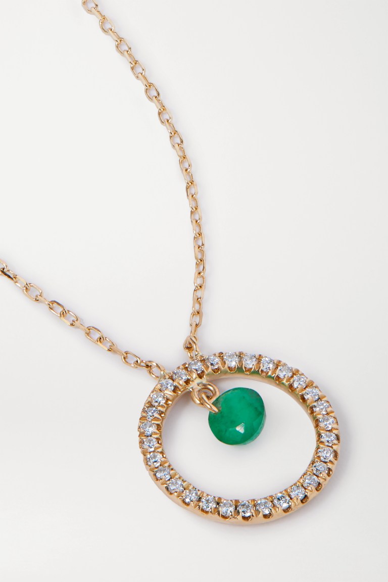 This pretty necklace is a bit daintier than it appears in the enlarged photo (fair warning!) By Persee and available at Net-A-Porter, it is “cast from 18-karat gold and strung with a circular pendant that’s traced with illuminating round-cut diamonds. The floating emerald is believed to promote balance in the heart chakra, enhancing unconditional love, friendship and unity. It’s the perfect gift to commemorate an upcoming anniversary or May birthday.”