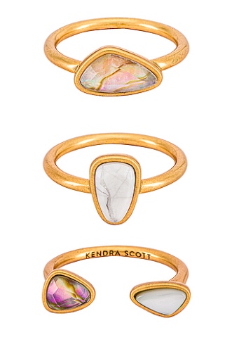 Stacking is still a huge jewellery option. Here, a set of three rings by Kendra Scott which can be worn individually or grouped. These are made of gold-plated brass set with abalone and what looks like mother of pearl.