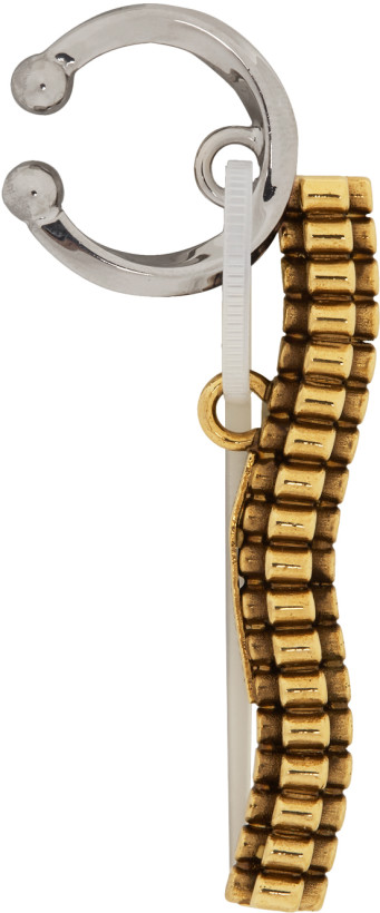 I like that the vendor has shown this earring on a male model. This single earring by Acne Studios is made with silver and gold toned brass, and tiny little zip tie detail.