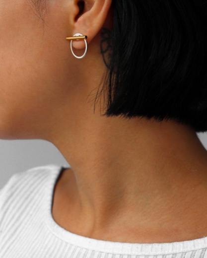These sleek modernist earrings by Jenny Bird give you some styling options. Wear them as they are or use your own centre piece stud. They explain, “Two separate pieces that hug your ear; the bar of the Rhye Earring Jackets can also be worn solo. Or personalize it and replace the bar with your favorite stud.Style note: Be careful to insert the post through post hole in the jacket, before placing the backing. Give the jacket a little tug, to ensure it is securely in place.”