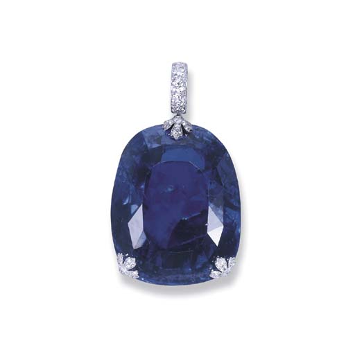They described it as, “A MAGNIFICENT AND HISTORIC SAPPHIRE PENDANT, BY CARTIER. The cushion-shaped sapphire weighing 478.68 carats held by diamond floral motifs at three points, diamond frame to the reverse and suspension hoop, with French assay mark for platinum
