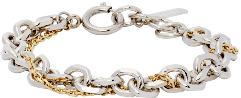 This intriguing bracelet by Justine Clenquet takes a fairly traditional link form and strands a gold coloured chain through it. Available from Ssense, they describe it as, “Double chain link bracelet in palladium and 24k gold-dipped brass. Nickel free. Logo plaque at adjustable spring-ring fastening. Approx. 7.25″ length.”