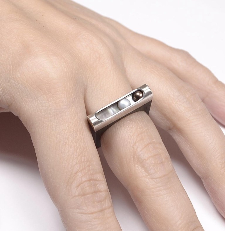 From Etsy seller Sense of Time Studio comes this modernist ring. The designer’s description: Unusual black wood ring. Regatta. Kinetic decoration of modern design. Two selected pearls, black and white, move smoothly across a plate of natural mother-of-pearl in a high-grade silver case. The basis of the ring of black wood, durable and beautiful. 100% author’s design and completely handmade.”