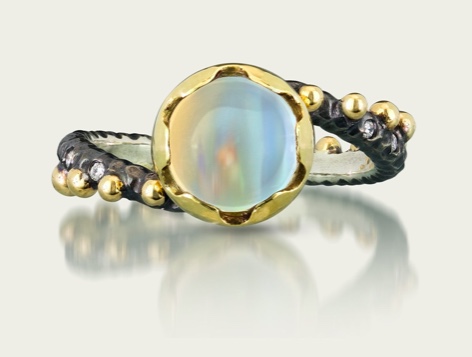 I am a sucker for opalescent gems, such as the large moonstone set in the centre of this ring by Svetlana Lazar. She describes the piece s, “A sense of undulating motion emanates from this twist on our Wishing Well collection. Inspired by a guardian sea creature of our own mythology, a hand carved Dragon Scale shank is accented with flush set diamonds, fused 18 karat gold granules, and crowned by a glowing Rainbow Moonstone cabochon set within an 18 karat gold scalloped bezel.”