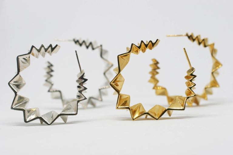 Hoops are eternally classic, and can be eternally reimagined. Like this “folded” pair by Perez Bitan. These are made with sterling silver with 18k yellow gold vermeil, and have a post back. (You can get them in all sterling silver as well.) Very funky design…