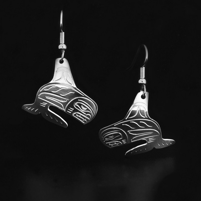 These beautiful sterling silver drop earrings are available from online vendor Artina’s. They note, These sterling silver diving orca earrings are hand carved by artist John Lancaster. He is of the Kwakwaka’wakw Nation and Nimpkish Band.