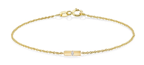If you are looking for gold jewelry that isn’t crazily priced, these bracelets by Lizzie Mandler are a great option. This piece is made in 18k yellow gold, with a small cylinder containing a .03 carat diamond. It’s also available in rose or white gold.