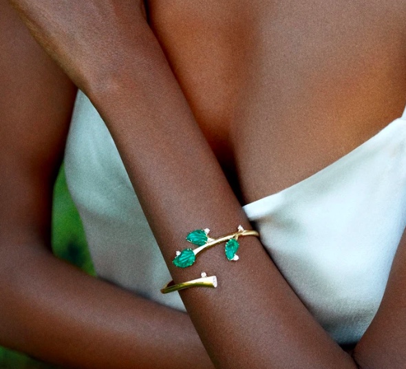 From Renna Jewels: “This golden branch encircles the wrist and features 5.76 carats of carved emeralds from the famed Muzo Emerald mine. It is further accented by brilliant diamonds and finished with an invisible clasp.”