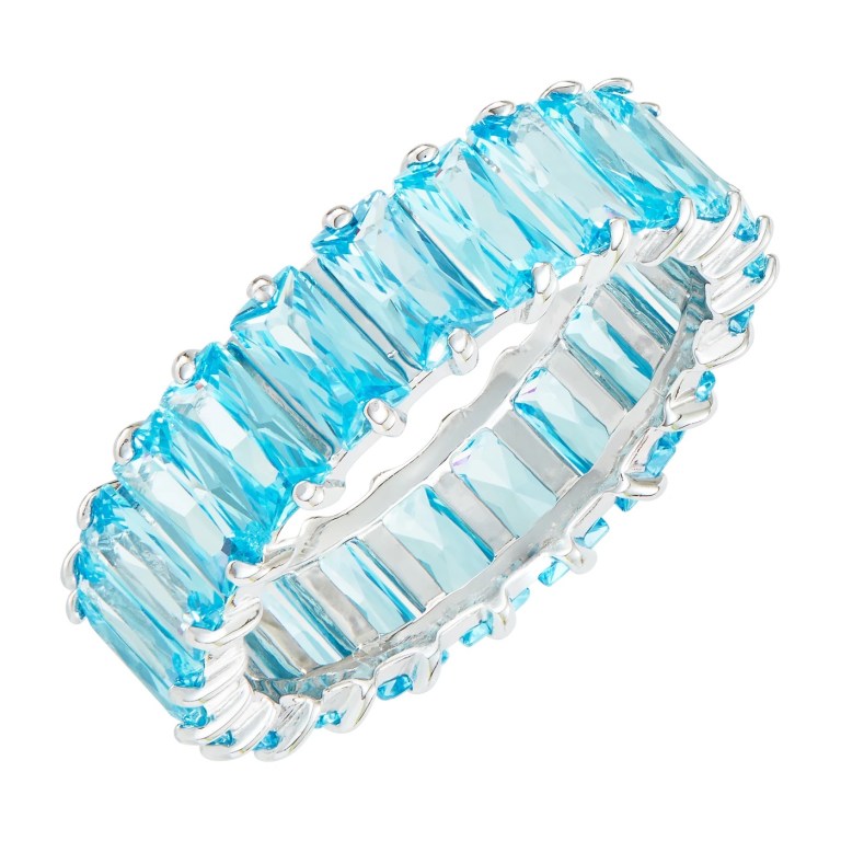 This eternity band is made with sterling silver and turquoise coloured cubic zirconia emerald cut stones. This sells for £90.