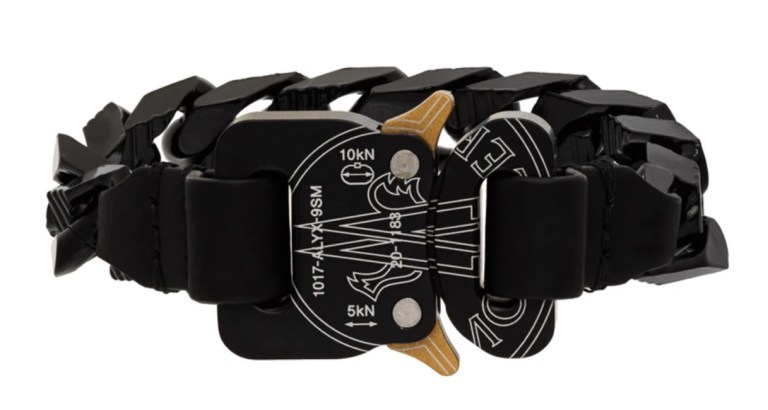 Moncler is best known for it’s very expensive outdoor wear – puffy jackets, ski wear, etc. They’ve apparently branched out into accessories. This bracelet is offered by ssense.com and they describe it as, “Alloy metal chain link bracelet in black. Signature logo-engraved anodized aluminium buckle with press-release fastening. Tonal hardware. Approx. 6″ length.”