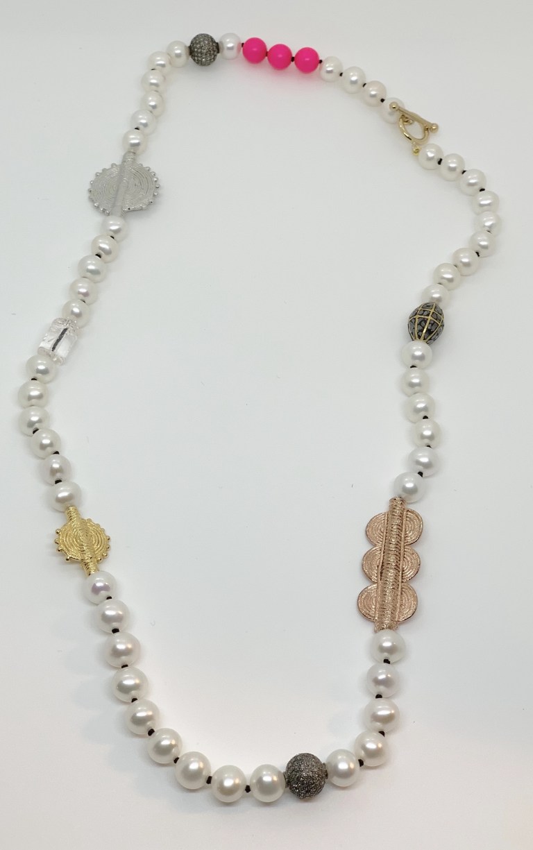 Mckenzie Liataudhas some really striking designs. Here, a pretty necklace made with “freshwater pearl strands stationed with some of Mckenzie’s favorite beads from around the globe : Rose , Yellow and Silver plated beads from Ghana, black diamond beads from India and Czech glass beads.”