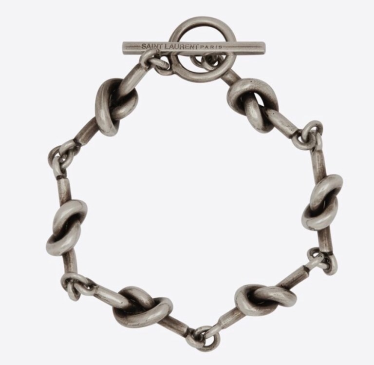 This cool knotted metal bracelet from Saint Laurent is a nice way to freshen (toughen?) up your look. This is made of brass with an oxidized silver finish; it sells for CDN$565.