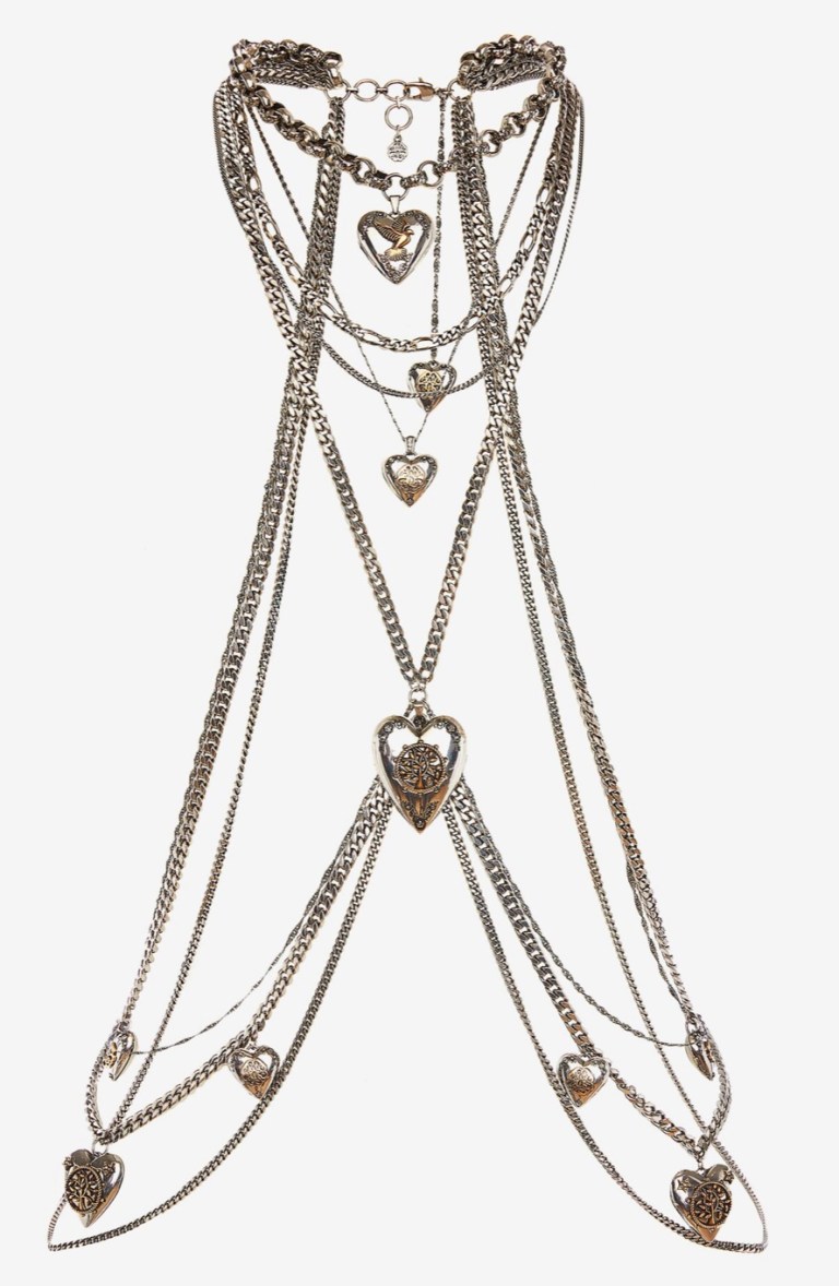 This is described as, “Antique silver-finished chain harness featuring heart locket charms with “Tree of Life”, “flying Dove” and “Seal” motifs. Brass hardware finished in antique silver. Adjustable fastening” and sells for USD$4,990.