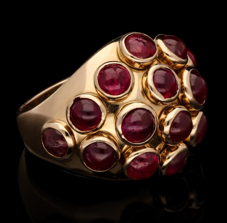 Designs by Suzanne Belperron are much lauded. This ring is described by 1st Dibs as, “A fabulous Retro gold and ruby ring by Suzanne Belperron c.1940s, the bombe style ring in highly polished 18ct yellow gold with sixteen well matched ruby cabochons set in raised bezel settings across the front, in seven vertical rows tapering from one stone at each shoulder to four stones in the centre row. This ring is typical of Belperron’s style, she often employed soft rounded and domed shapes in her jewels and cabochon gems feature frequently, this is a lovely example of her motto “My style is my signature.” “