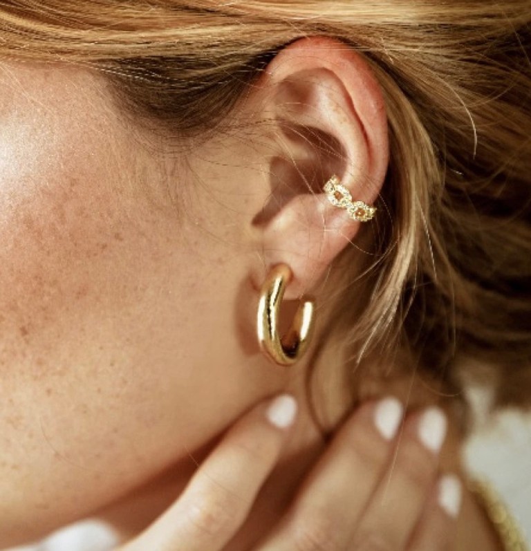 A cute way of jazzing up your earring look – a crystal studded ear cuff from Alexa Leigh. The crystals are set in gold plated base metal. No piercing is required to wear this ear cuff.