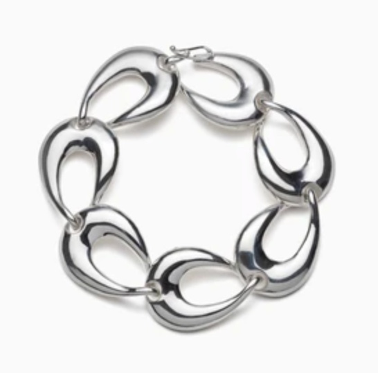 This bracelet by AgmesNYC reminds me of older Georg Jensen pieces. Like Jensen, it is also made of sterling silver. This measures 7″ long and 3/8″ wide and sells for USD$650.