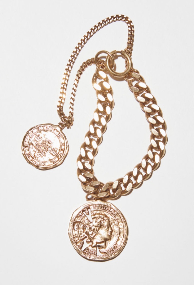 This charm bracelet has two branded coins on them – Republic of Acne for the win, clearly – on a curb link chain. It’s also available in an antiqued silver.