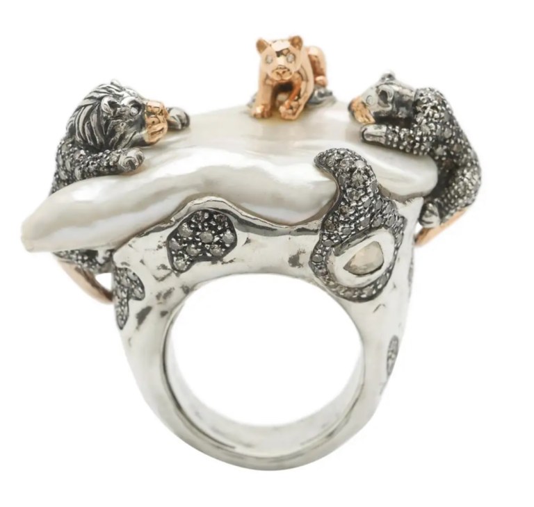 This shows a family of lions, designed by Bibi van der Velden and for sale at 1st Dibs. The site notes, “A luminous baroque pearl is home to a family of lions in this striking cocktail ring, part of Bibi van der Velden’s Animal Collection. The sterling silver ring is set with three lions fashioned in 18k rose gold and sterling silver, with the design set with brown and white diamonds.”